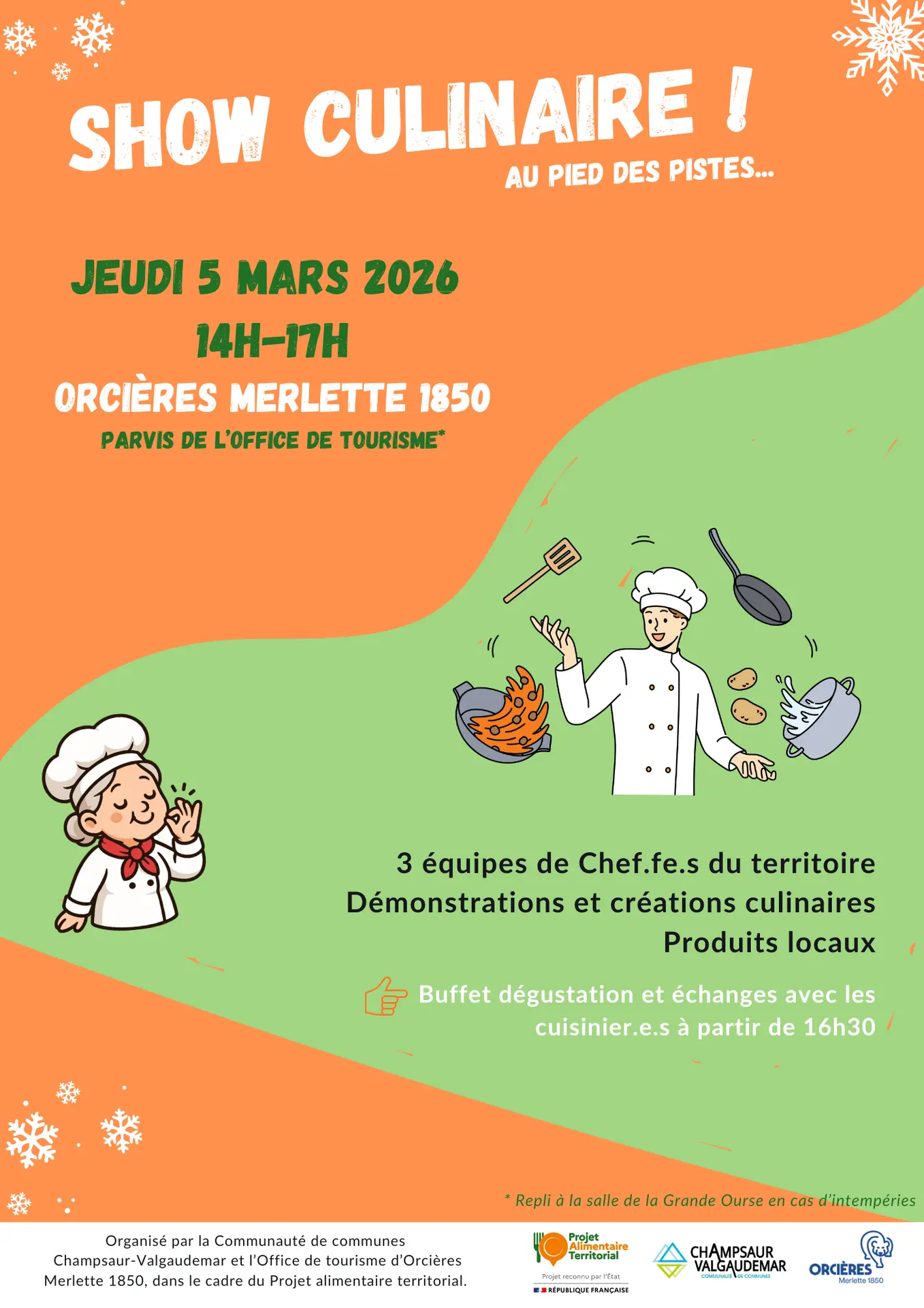 Dans le cadre du Projet alimentaire territorial (PAT), la Communauté de communes Champsaur-Valgaudemar, en partenariat avec l’Office de tourisme et la commune d’Orcières, organise un show culinaire au pied des pistes !