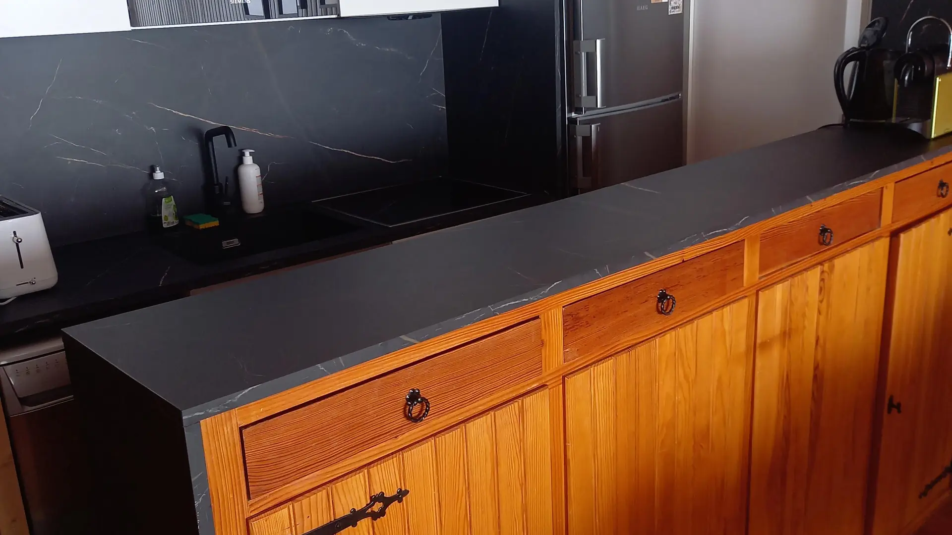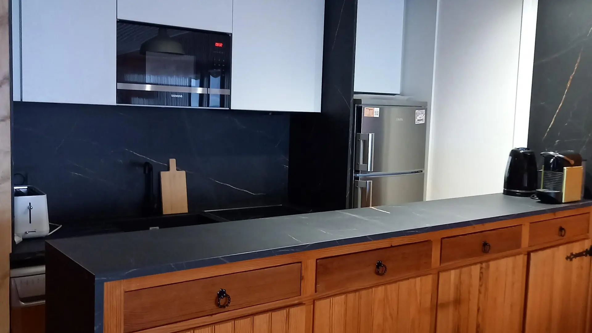 Cuisine équipée , réfrigérateur, congélateur, four, cafetière nespresso, appareil à raclette