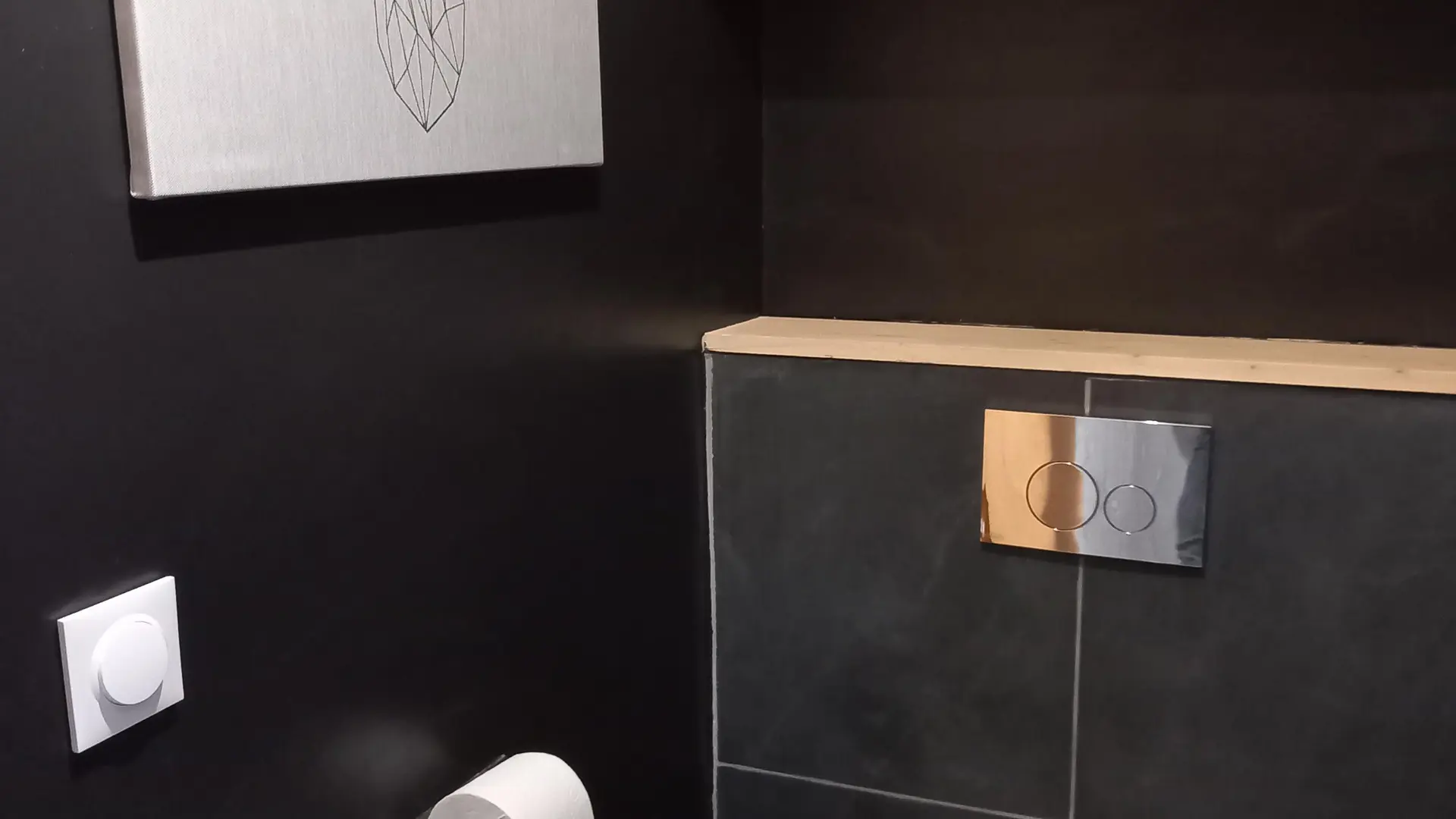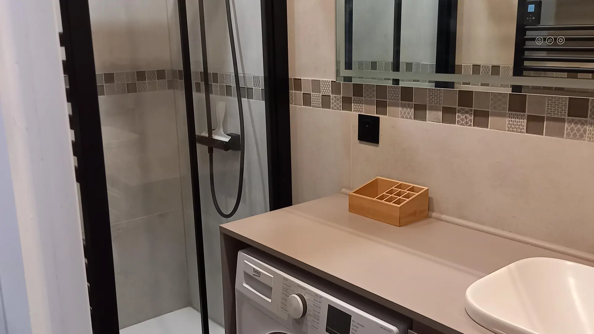 Salle de bain avec douche, machine à laver