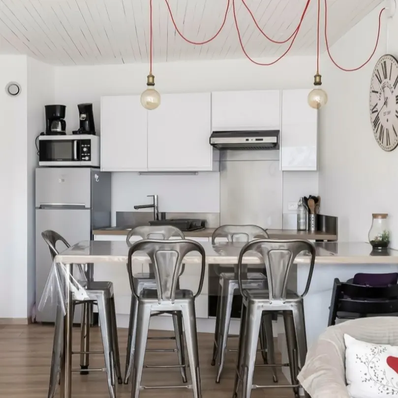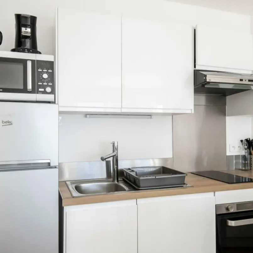 Une cuisine équipée, lave vaisselle, réfrigérateur, congélateur, cafetière Senséo, appareil à raclette