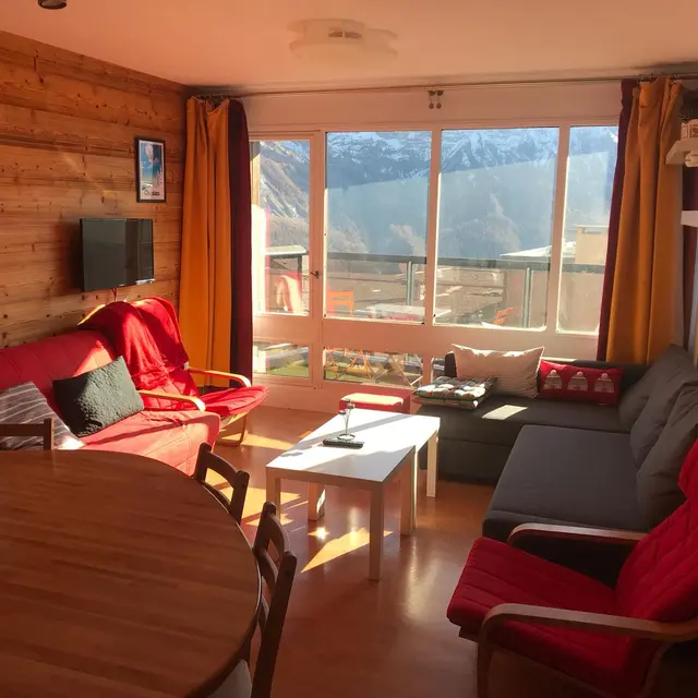 * Un salon séjour avec un canapé d’angle et un canapé BZ, table, écran plat 70 cm, jeux de société et une terrasse de 5 m2 avec superbe vue sur les montagnes (table et chaises, exposition sud).