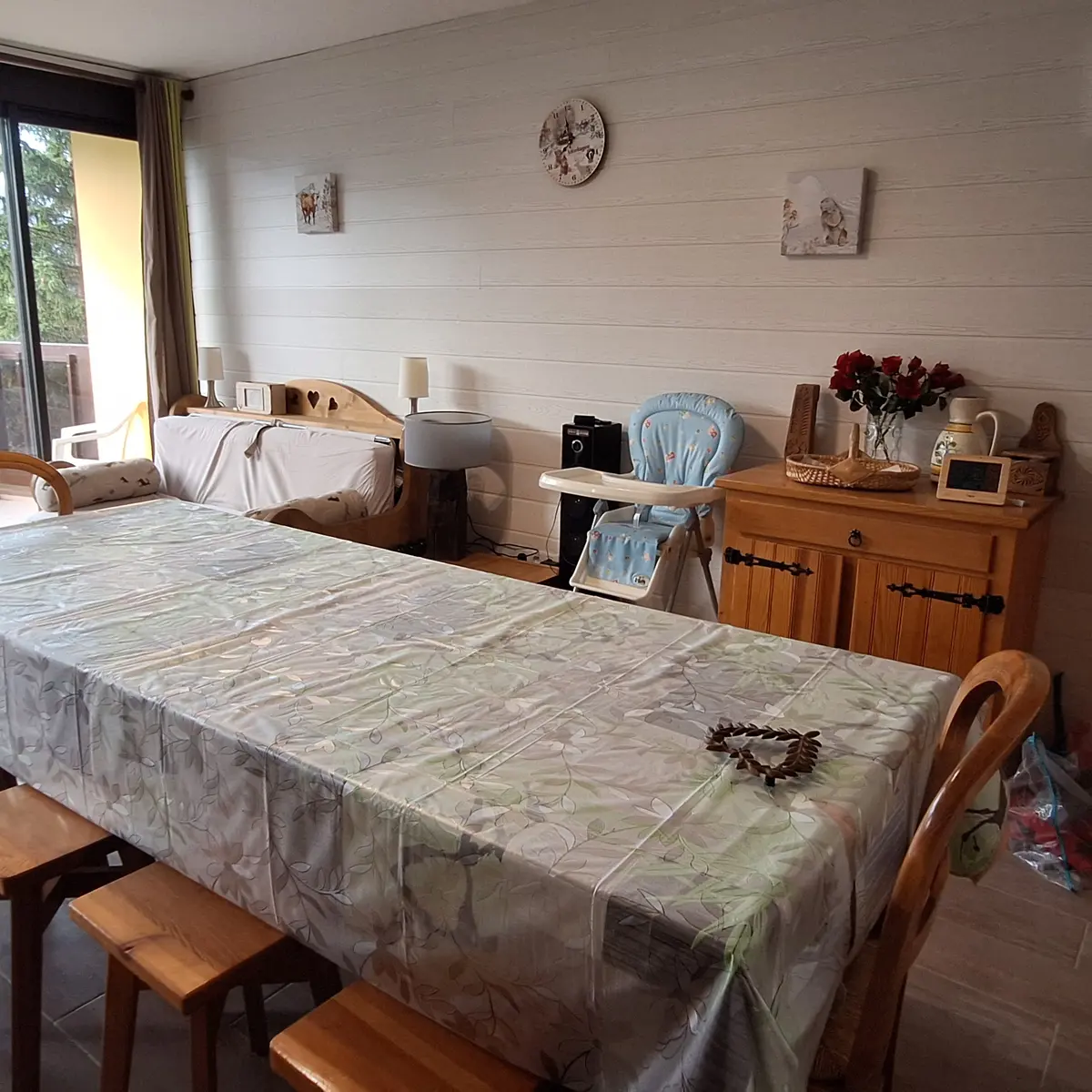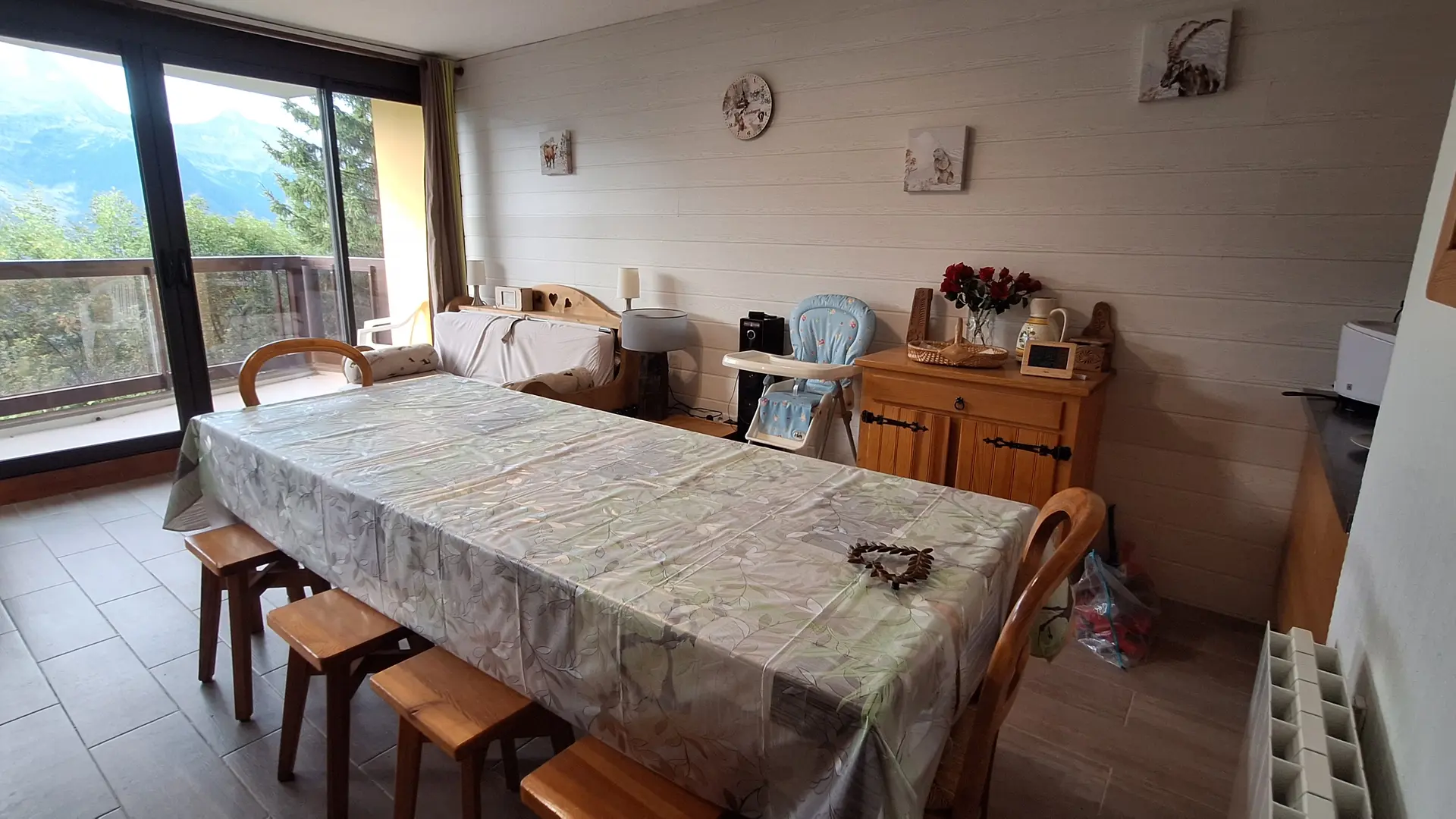 La salle à manger est équipée d'une table pouvant accueillir 8 personnes, d'un canapé convertible "rapido"de 140 x 190, volet roulant électrique, une télévision, robot aspirateur, un balcon avec vue sur les montagnes.