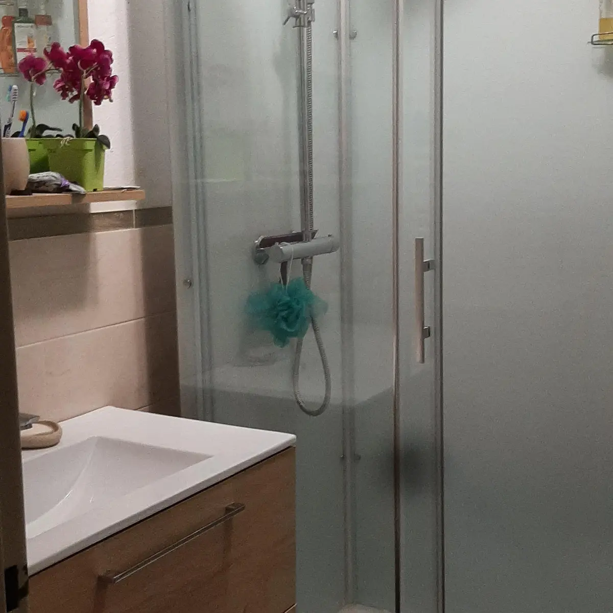 La salle d'eau : une douche de 80 x 110, un meuble vasque, un miroir, un lave linge 6 kgs, un sèche serviette, un sèche cheveux