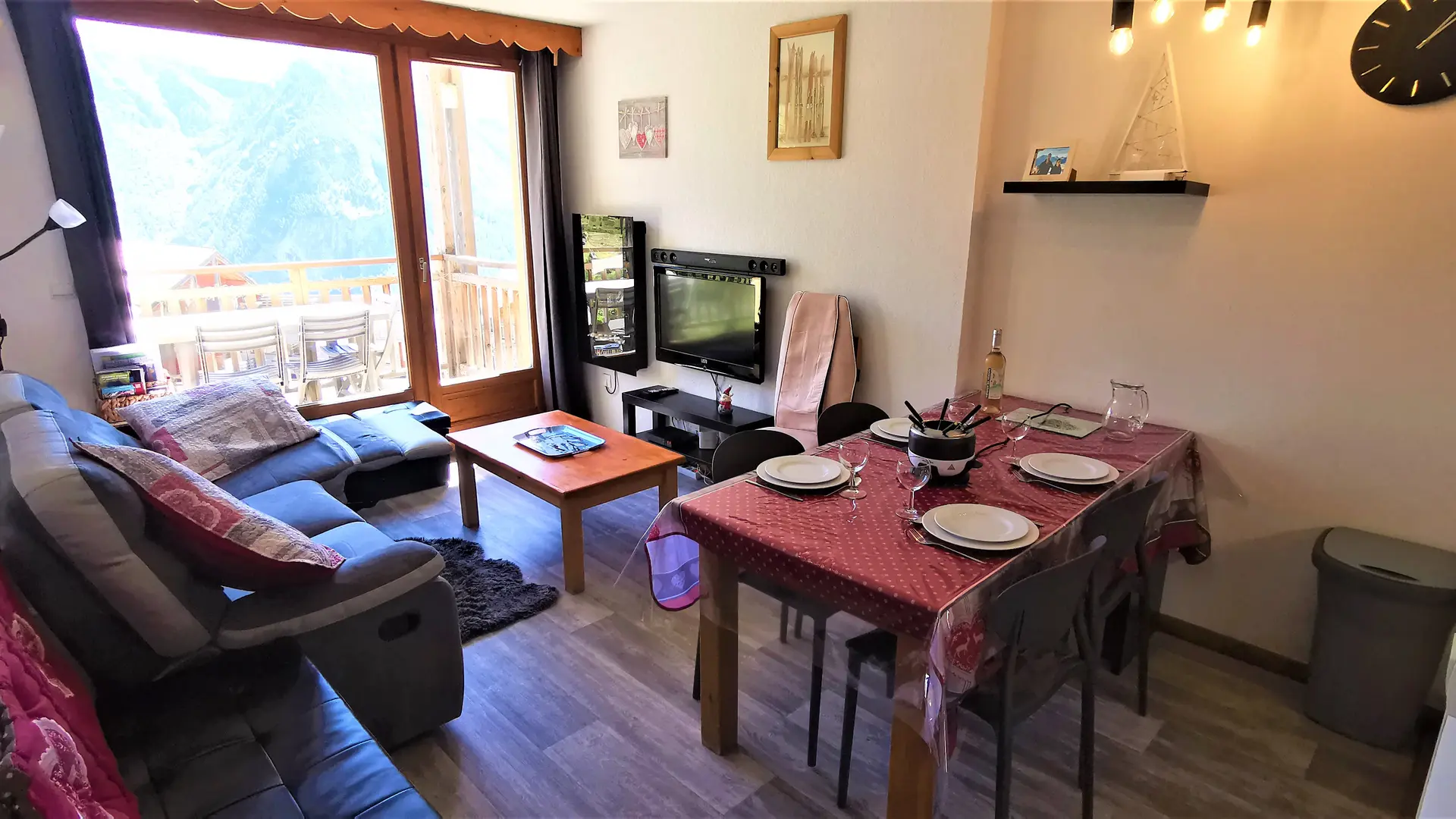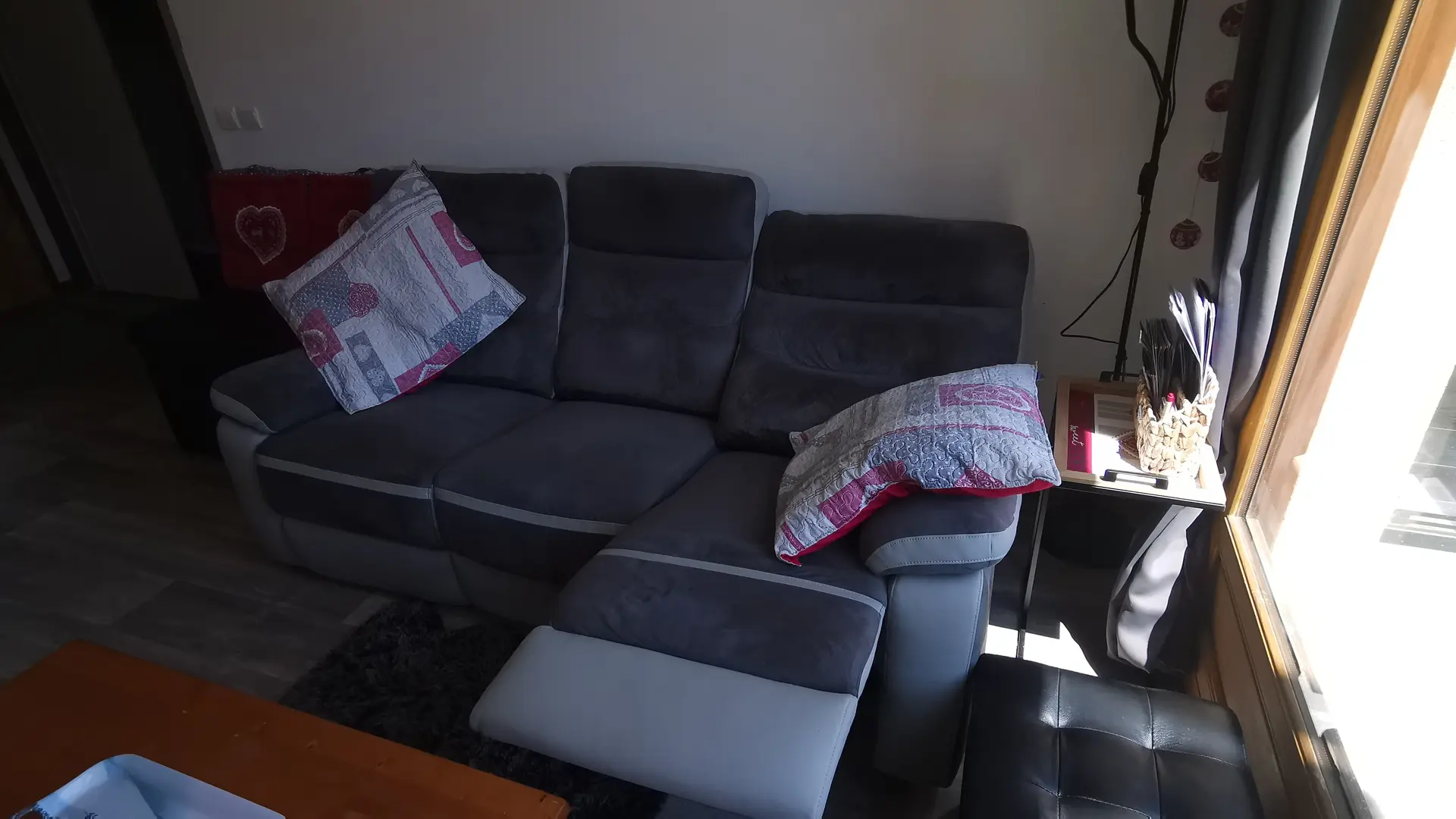 * Un salon séjour avec canapé relax, écran plat LCD, barre de son Bluetooth, chauffage effet cheminée, dispositif massant, jeux de société et un balcon de 7m2 avec vue sur la vallée et salon de jardin (exposition sud/est).