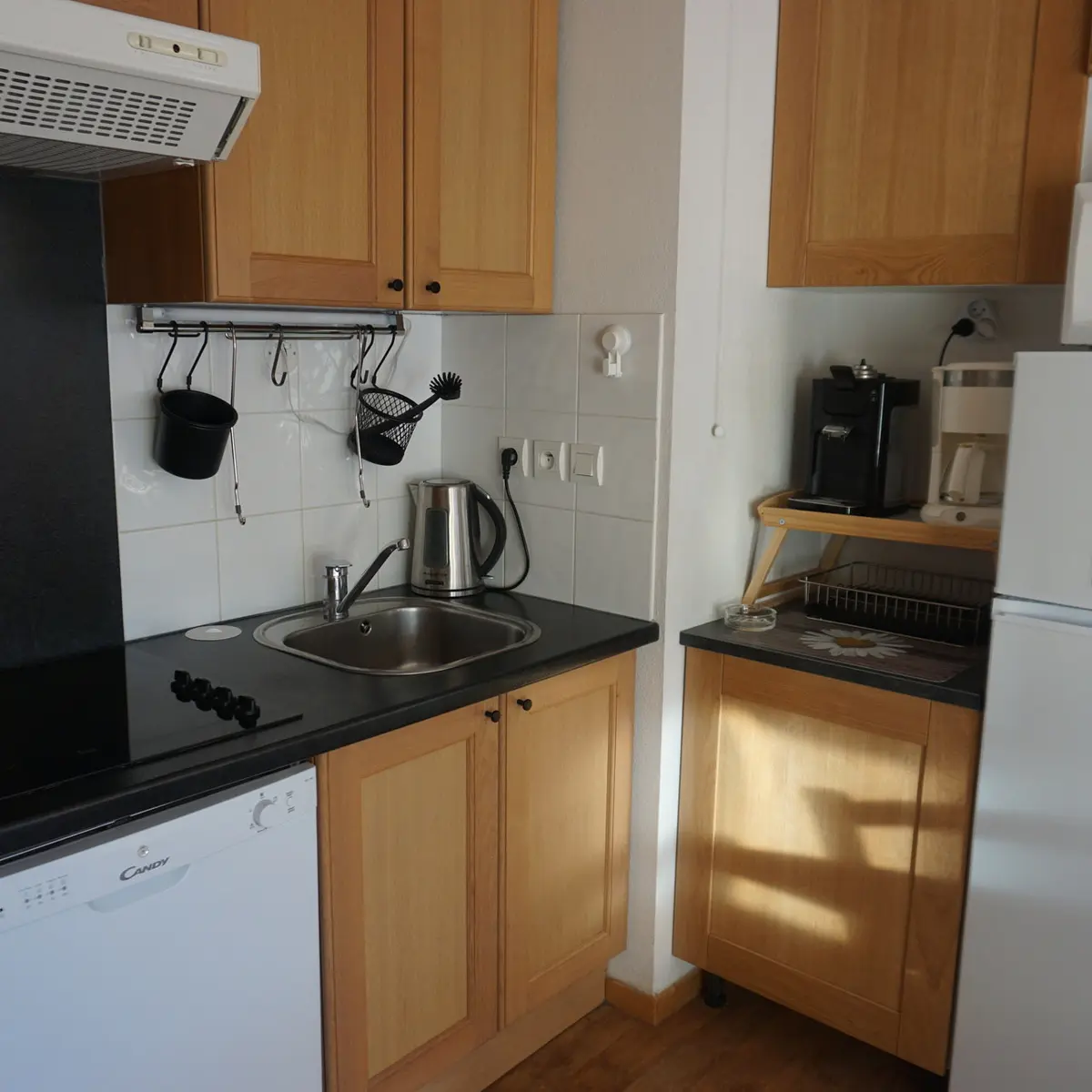 Coin cuisine : 4 plaques vitrocéramiques, frigo/congélateur, micro-ondes, mini-four lave-vaisselle.