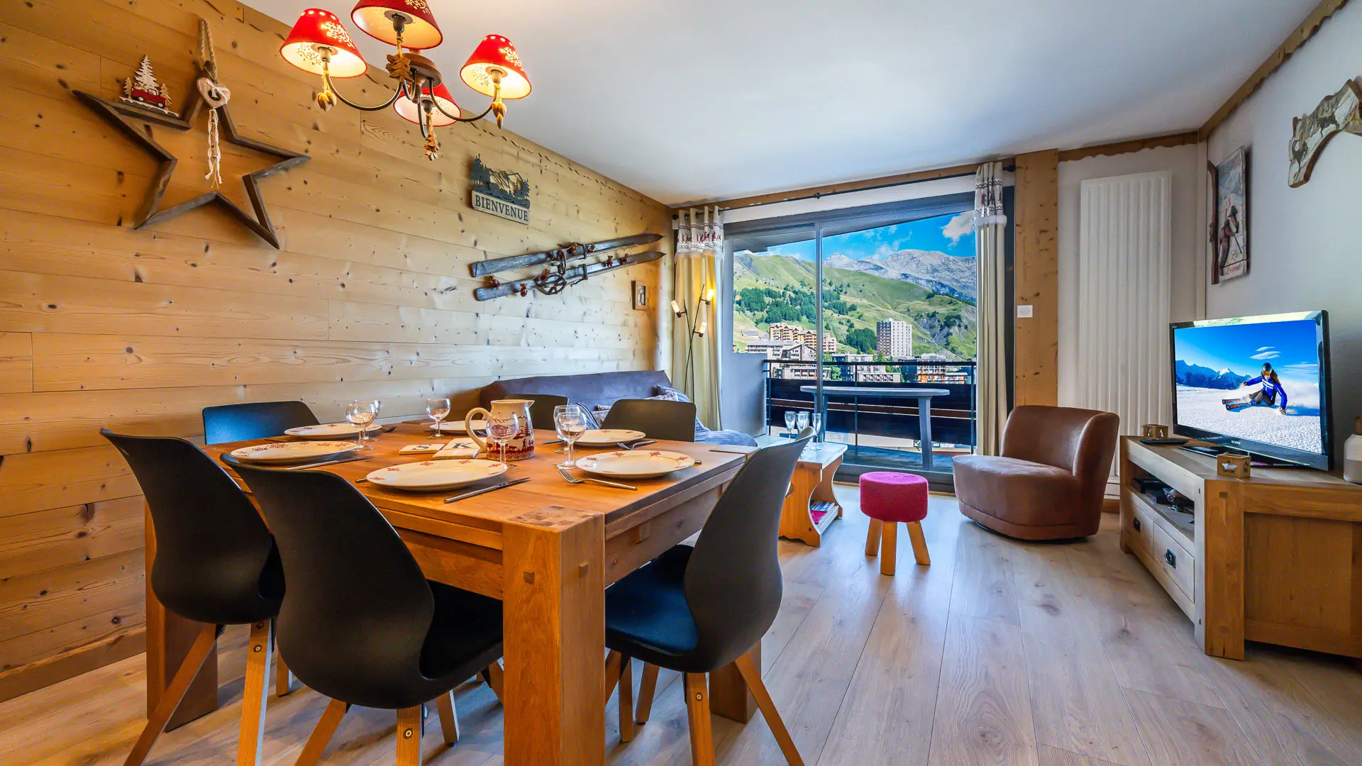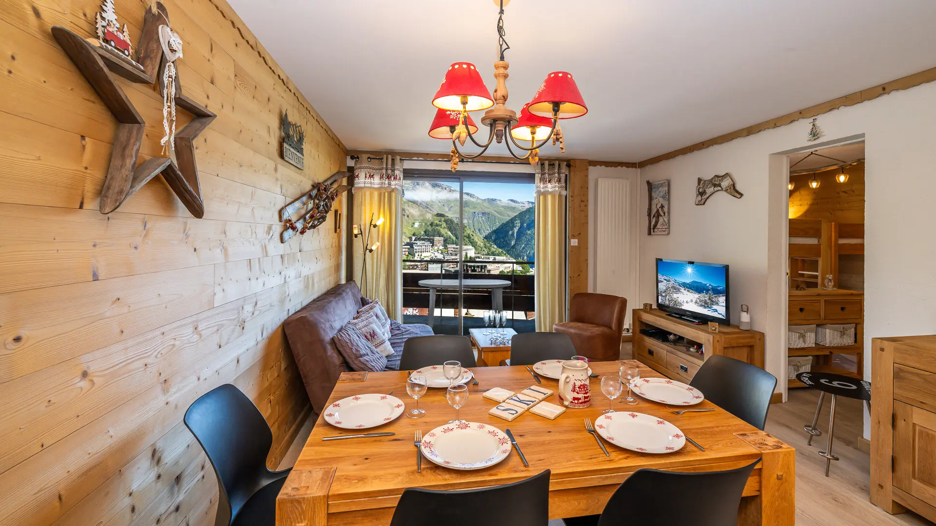 télévision écran plat, lecteur dvd, table avec 8 chaises, buffet, jeux de société, DVD