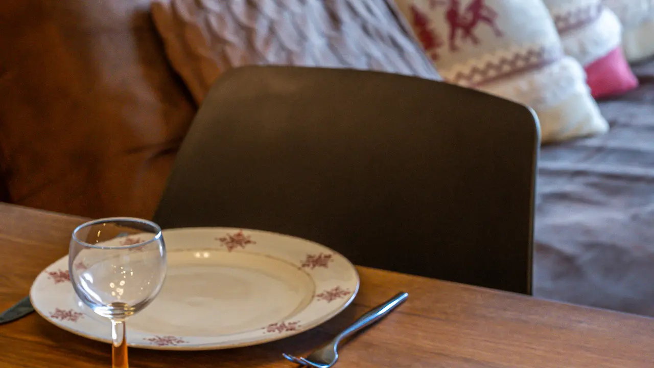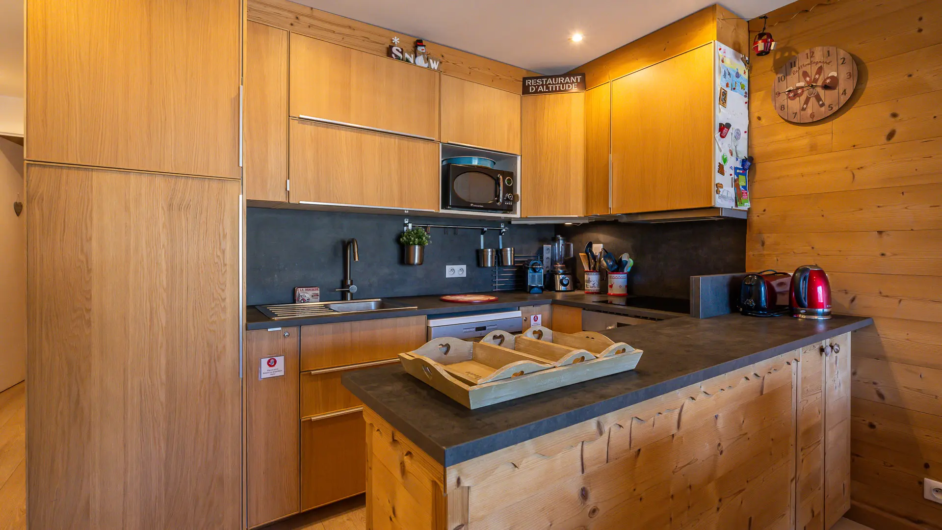 Cuisine équipé : four, micro-ondes, plaques à induction, lave-vaisselle, réfrigérateur avec compartiment congélateur, vaisselle, cafetière électrique et nespresso, bouilloire, grillepain, appareil à raclette, à crêpes et à fondue, plancha