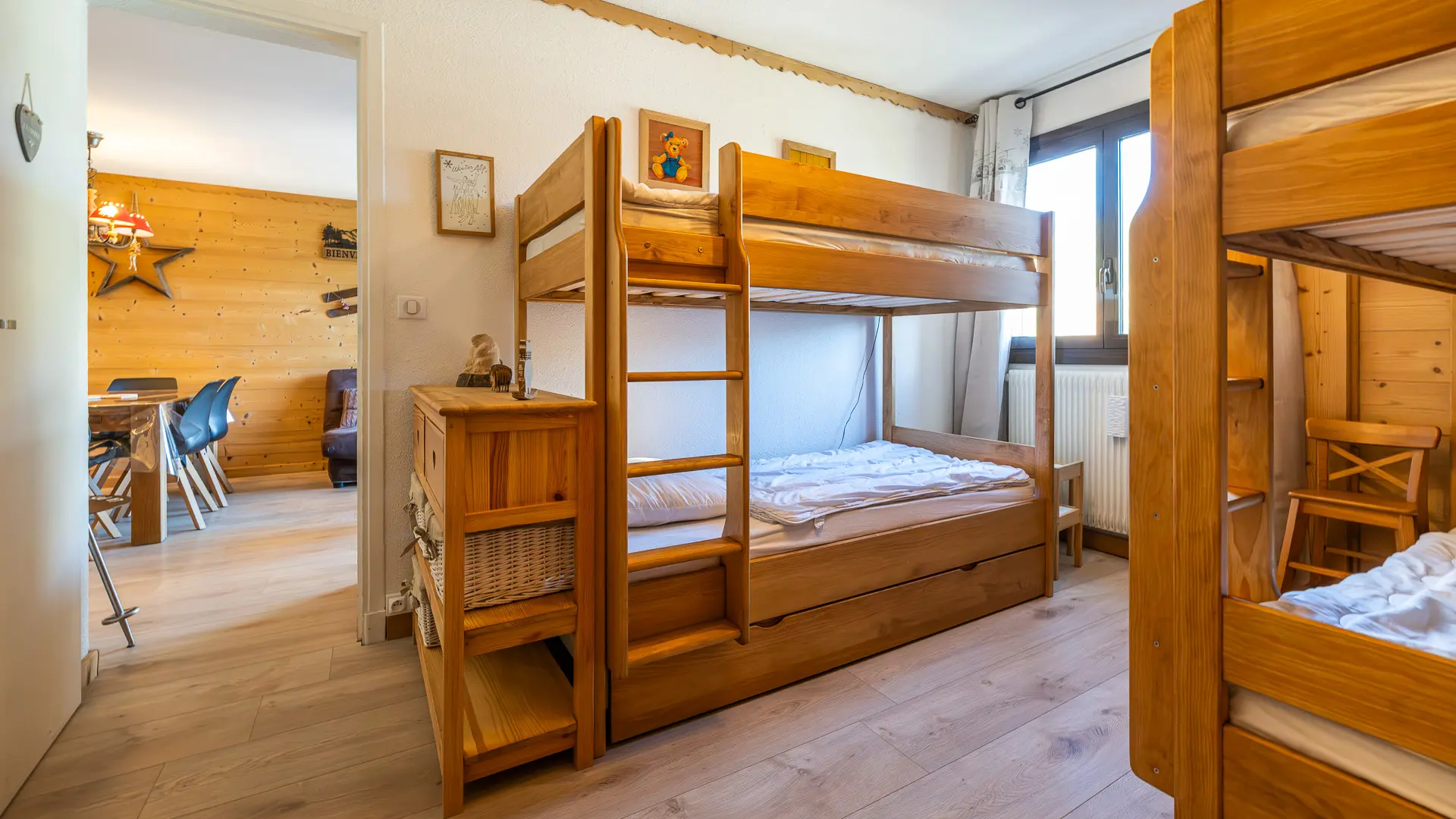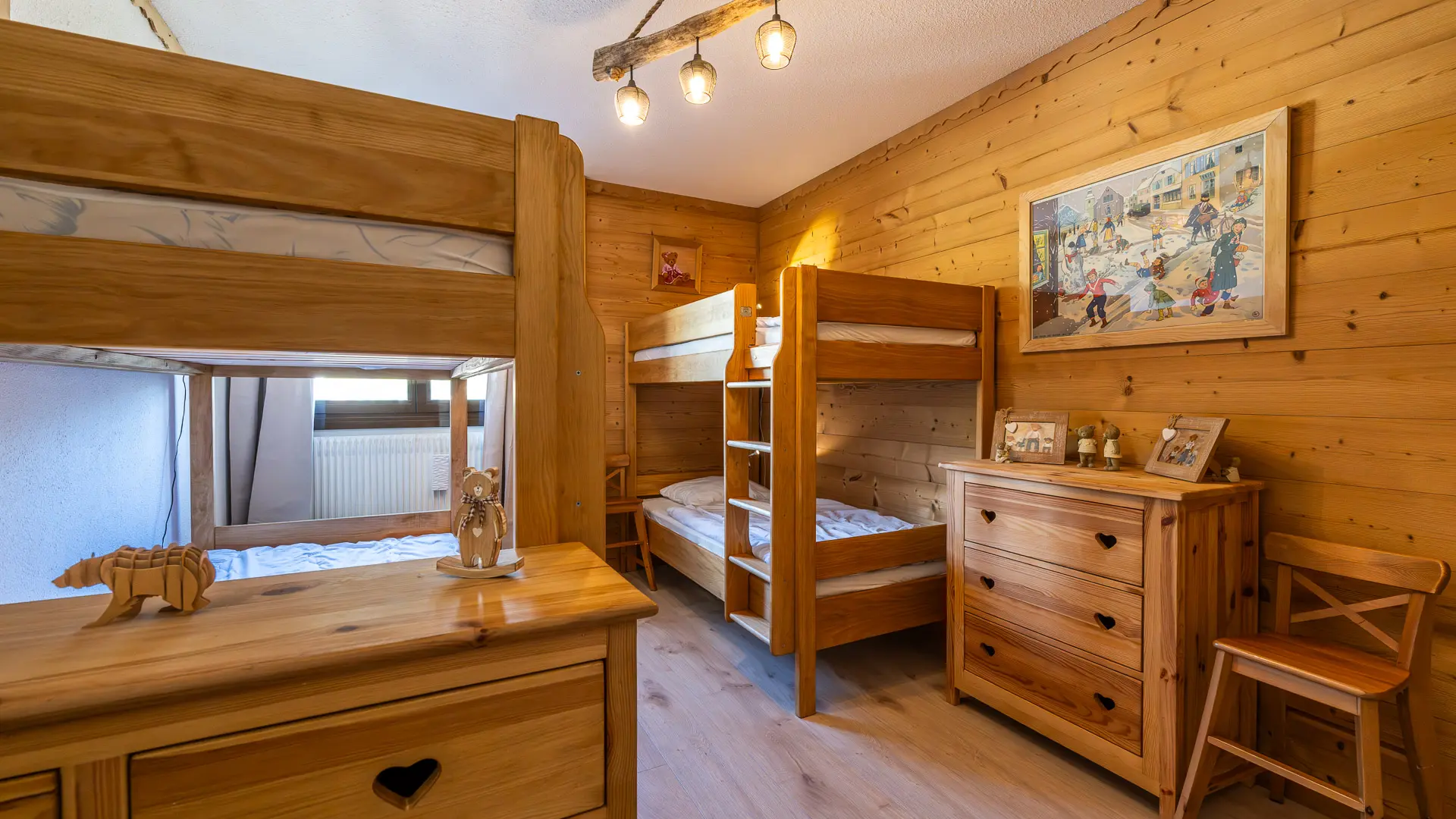 Chambre avec 4 couchages individuels (2 lits superposés en 90), 1 commode, 1 étagère