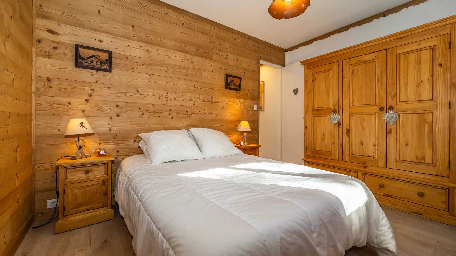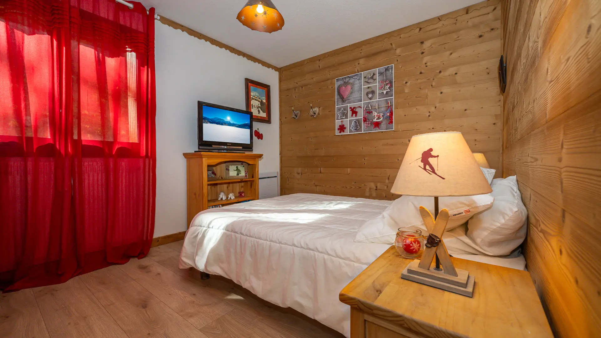 Chambre avec un lit double (140), armoire, étagère avec TV et BD, 2 tables de chevet