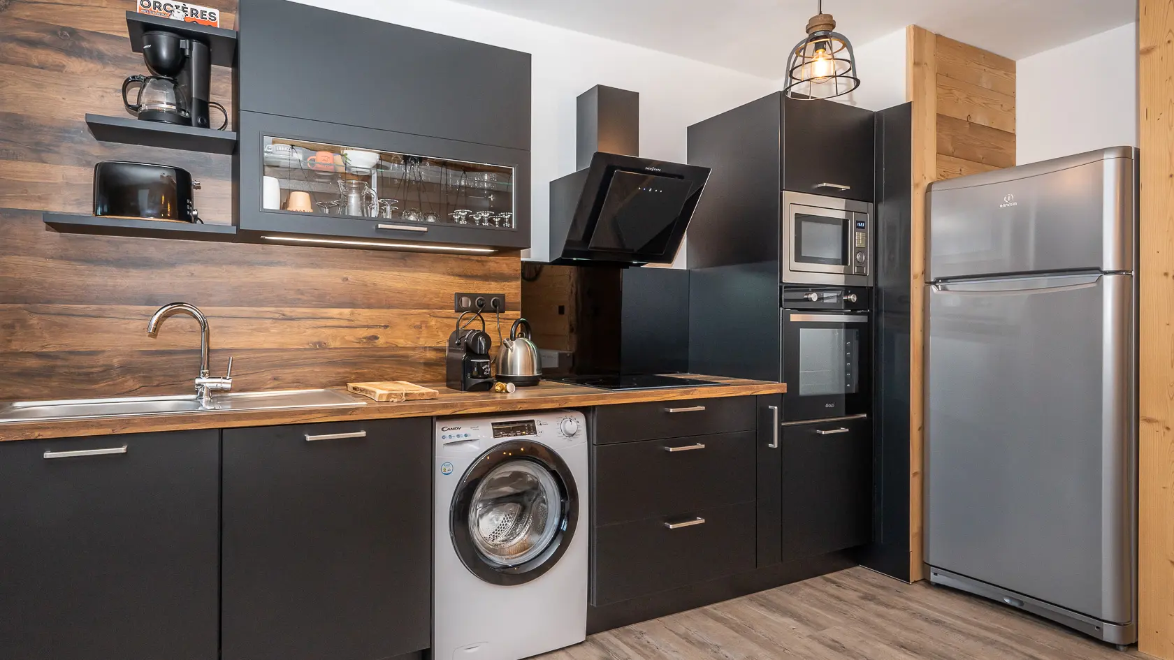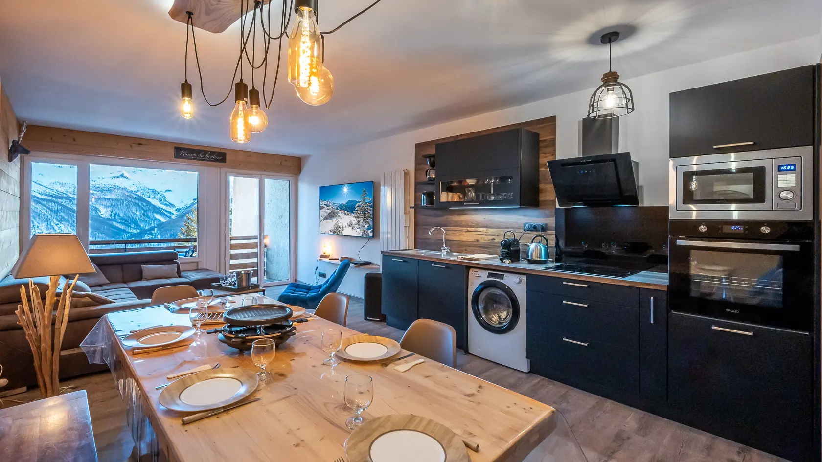 Grande pièce à vivre avec cuisine ouverte (plaques induction, lave vaisselle, réfrigérateur)