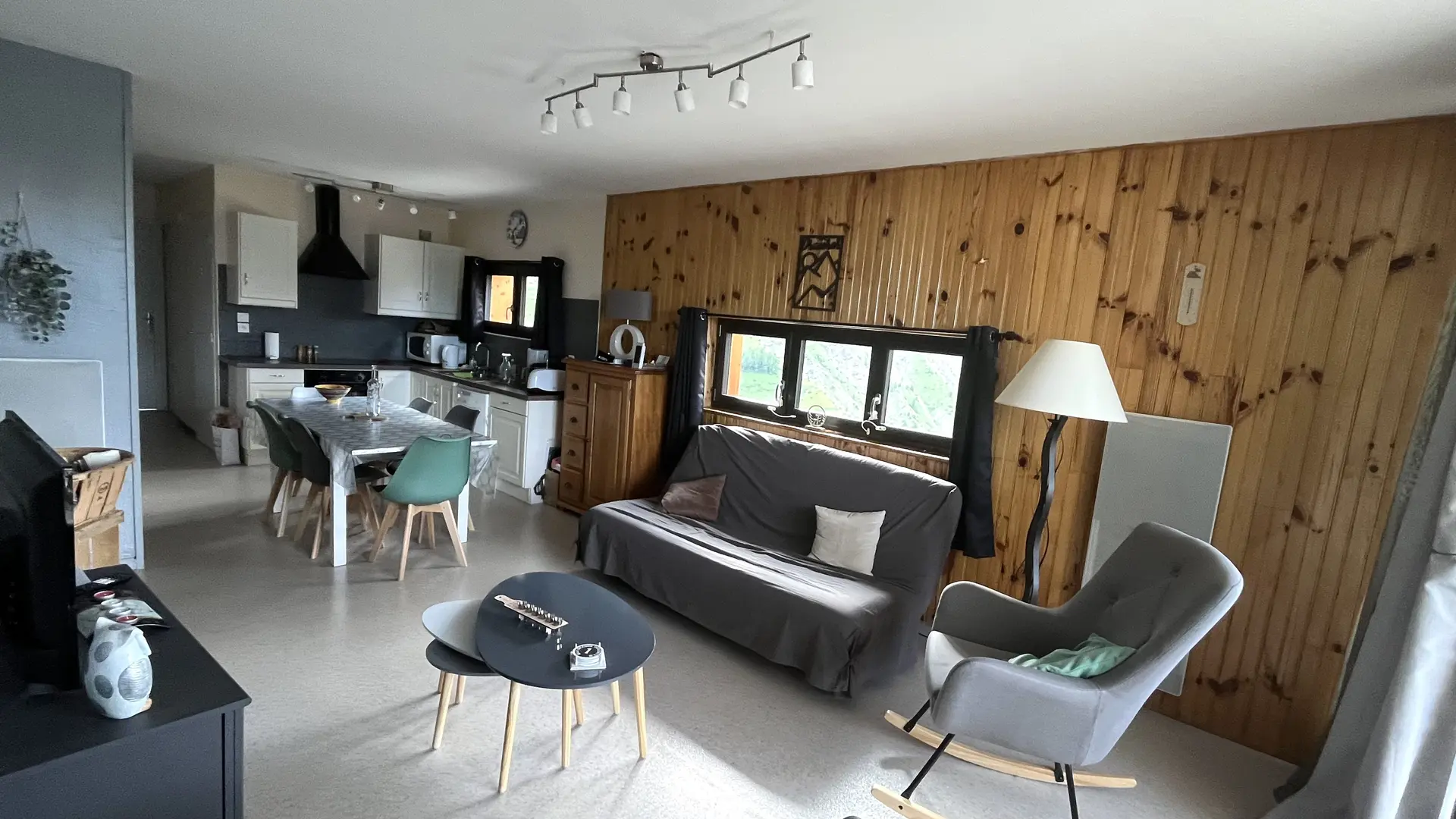 Cuisine ouverte sur séjour et balcon avec vue dégagée sur les montagnes.