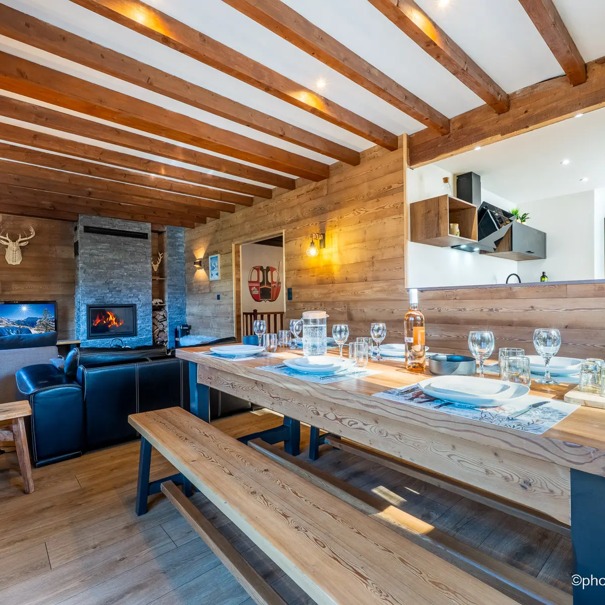 Grande pièce de vie de 40 m² avec de larges baies vitrées offrant une vue panoramique sur la montagne sans vis a vis, comprenant un coin salon avec cheminée et espace repas avec grande table et bancs en bois. Cuisine entièrement équipée ouverte sur l espace repas.