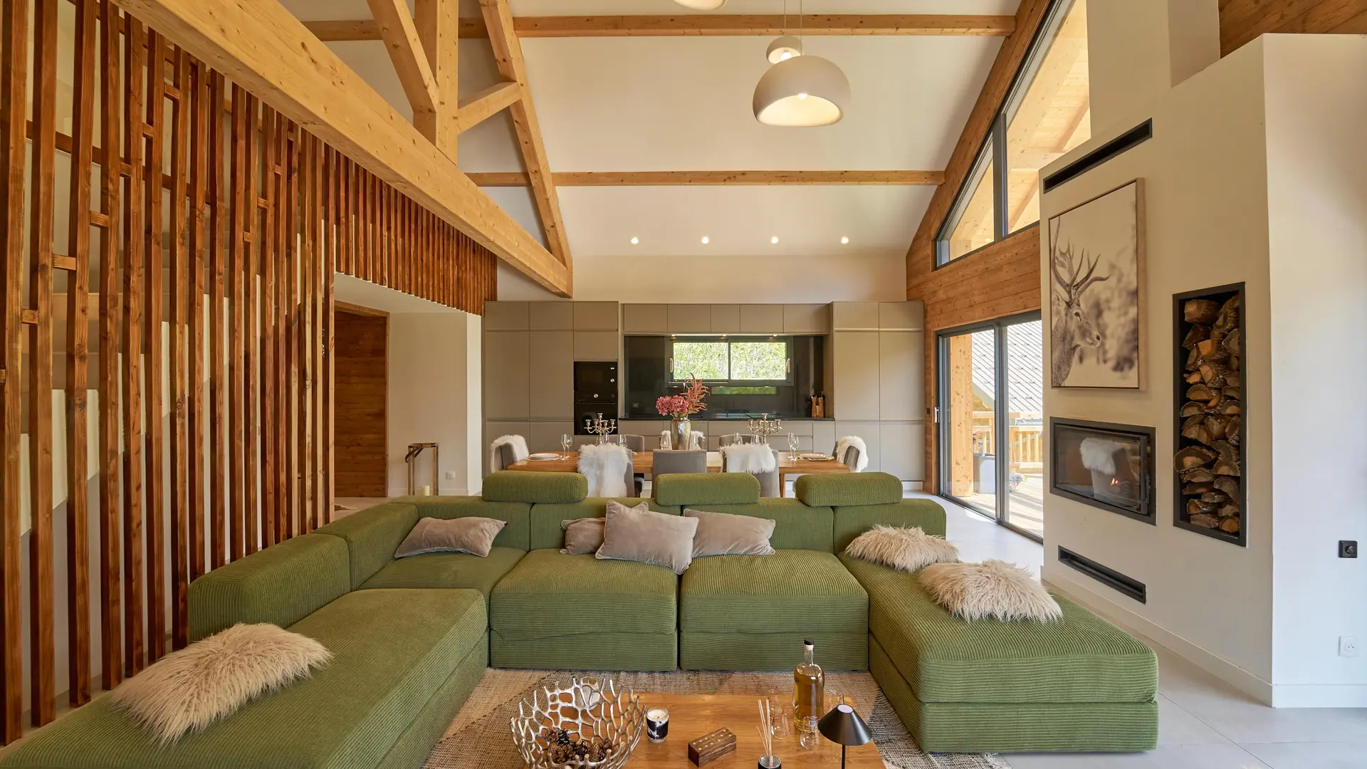 Dès l’entrée, le ton est donné : volumes généreux, matériaux nobles, vues spectaculaires… Installez-vous dans un salon baigné de lumière, lové près de la cheminée centrale pendant que la neige tombe doucement dehors ou que le soleil d’altitude chauffe la terrasse. Le design intérieur mêle avec goût charme montagnard et touches contemporaines : un cocon chaleureux et raffiné où il fait bon vivre.