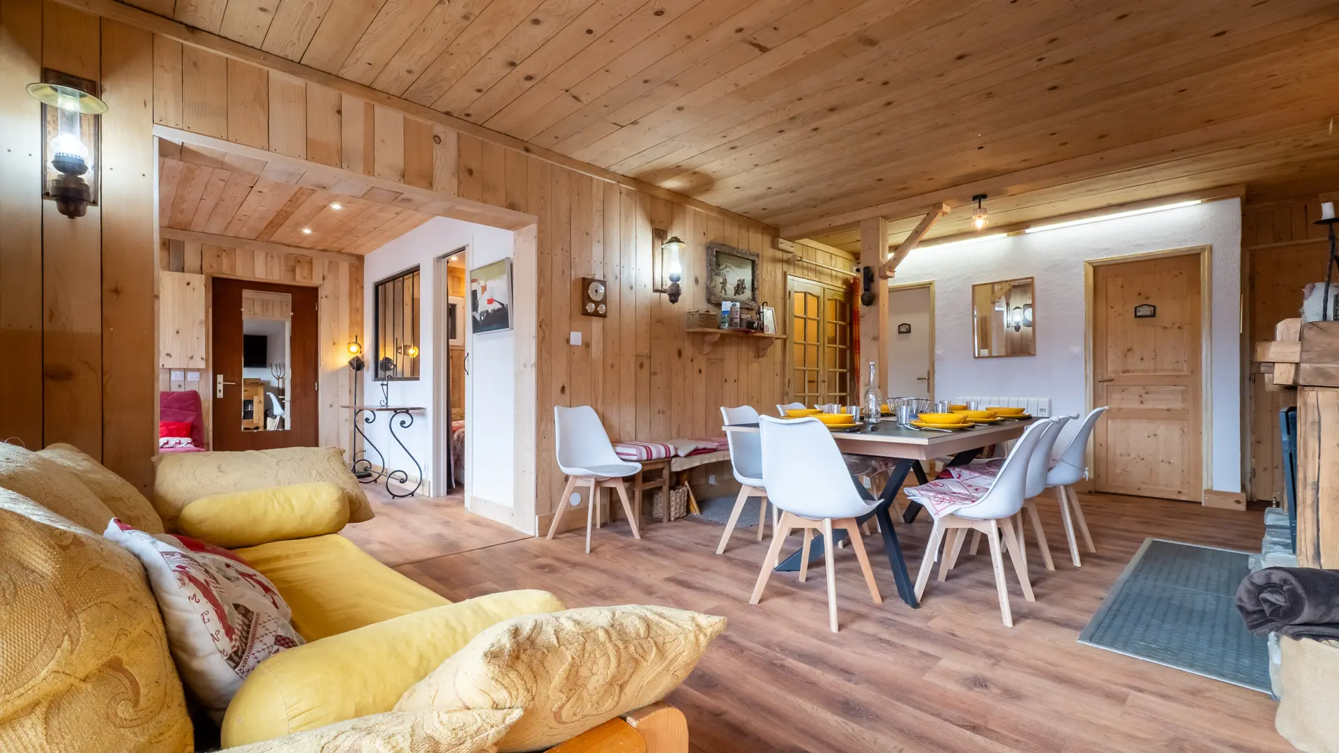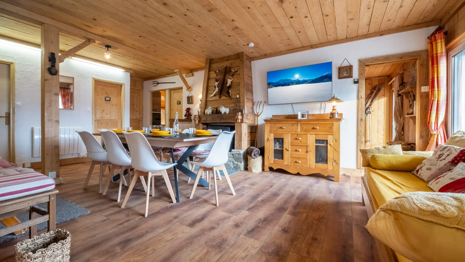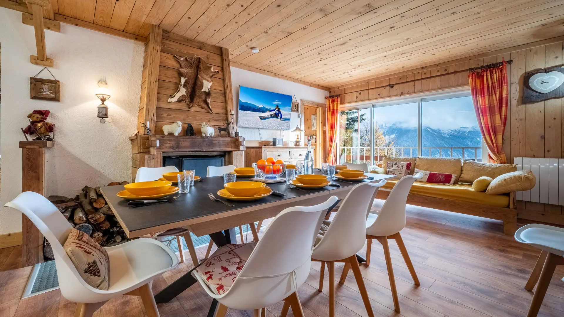 La décoration s’inscrit dans un style typiquement alpin : matériaux nobles, finitions de qualité, objets traditionnels et notamment de vieux skis en bois accrochés aux murs, renforçant l’esprit chalet.
