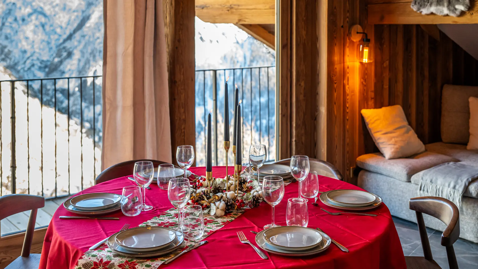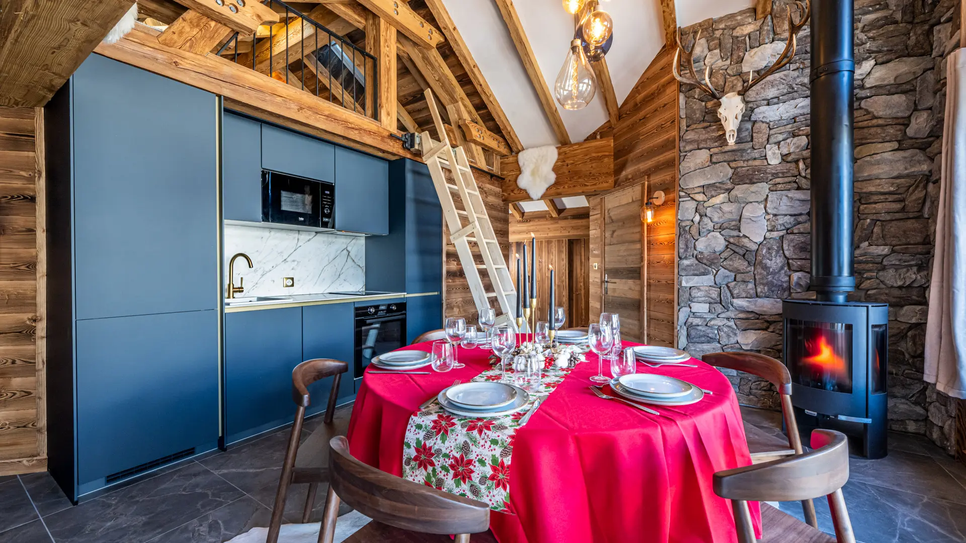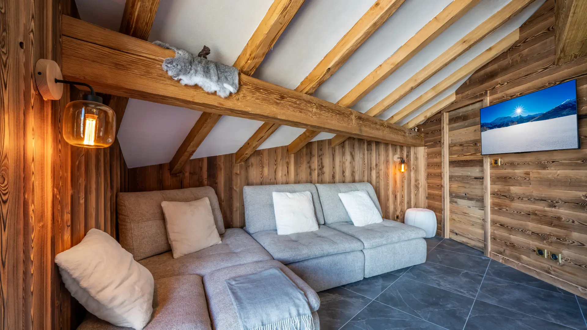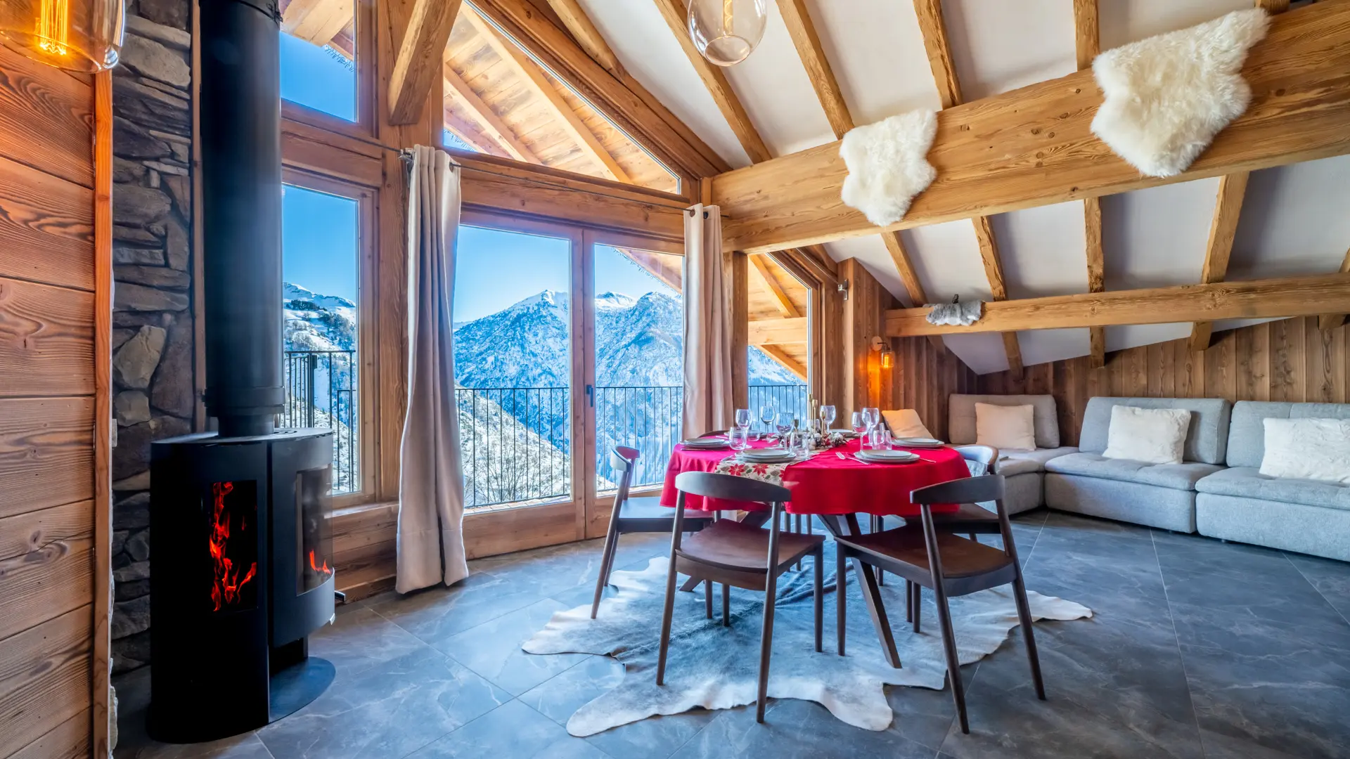 Une pièce a vivre vue montagne avec canapé modulable et cuisine équipée