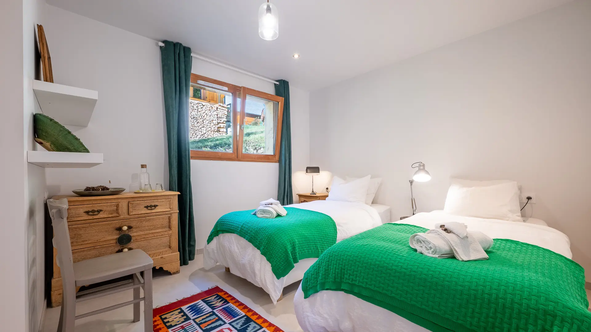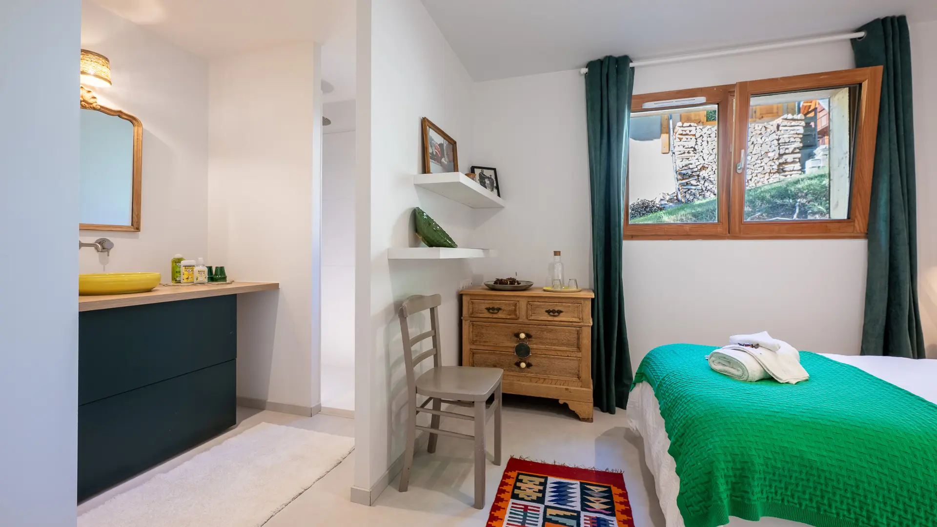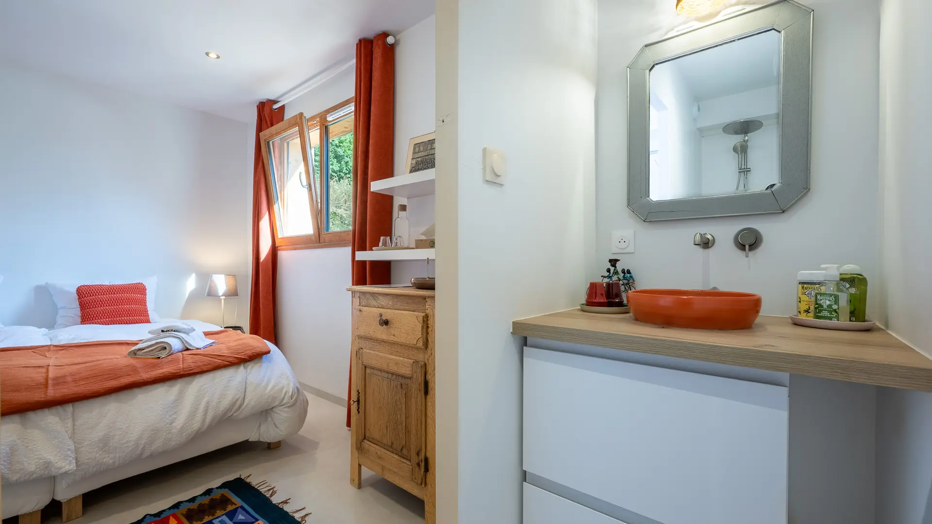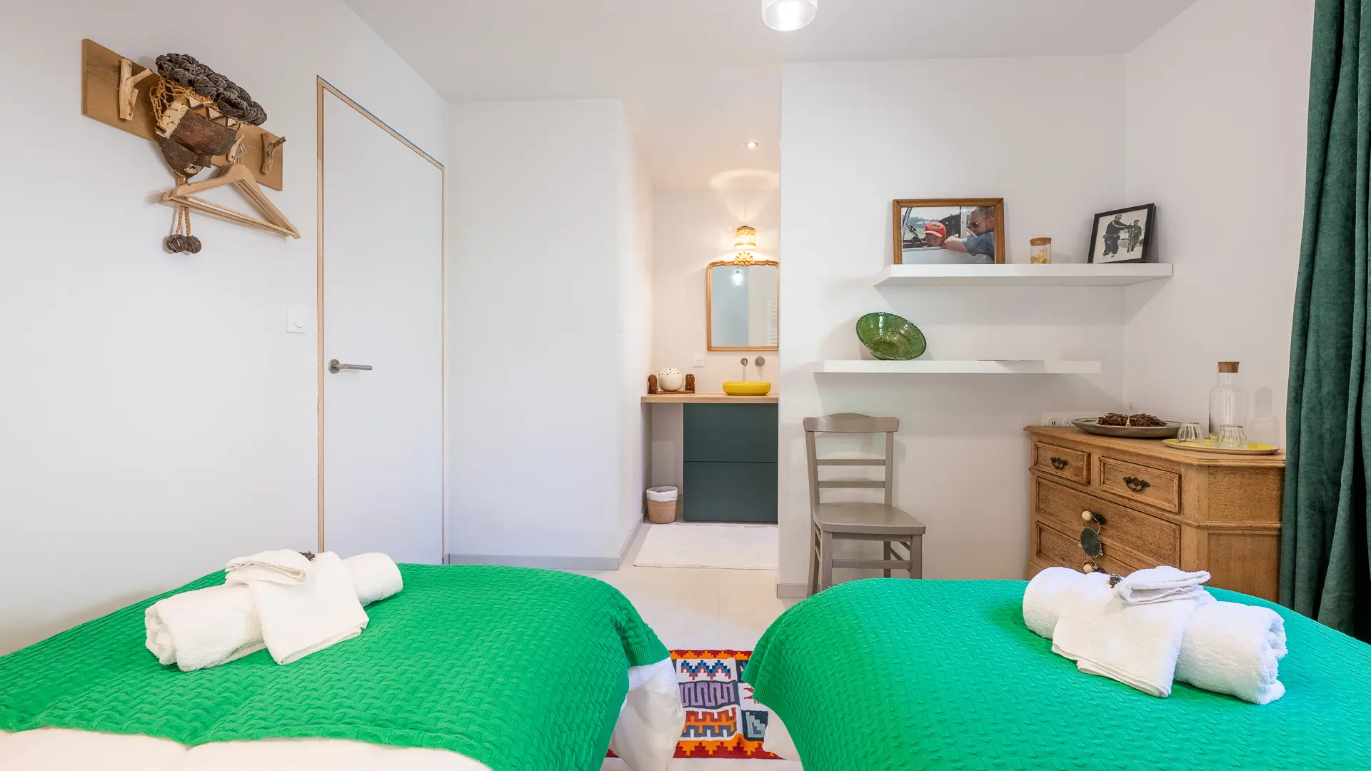 Une chambre avec lit double en 180 et salle de bain privative - Le grand lit peut être séparé en 2 lits