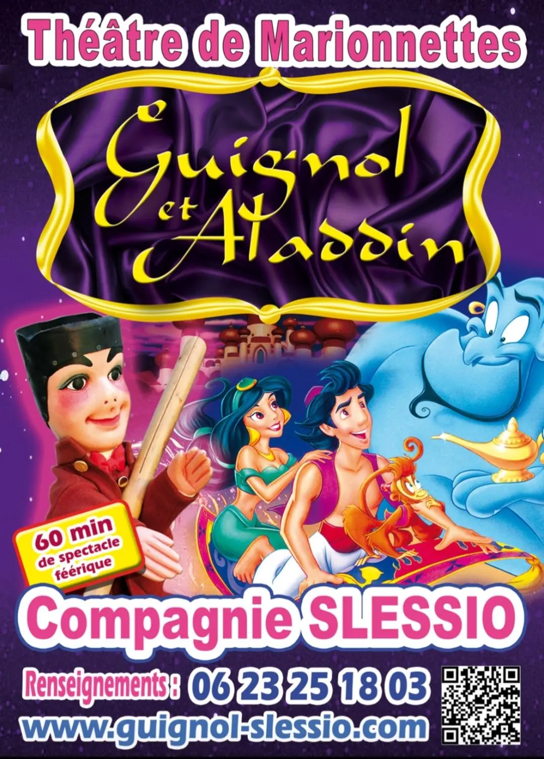 Venez vous plonger dans l'univers des mille et une nuits ! Dans une ambiance féerique ,venez découvrir ce magnifique spectacle familiale, riche en émotions avec nos célèbre marionnette présenté par la Compagnie Slessio "Guignol et Aladdin" avec bien sûr le clou du spectacle qui est notre signature l'apparition du Génie et Jasmine pour une séance photo magique.