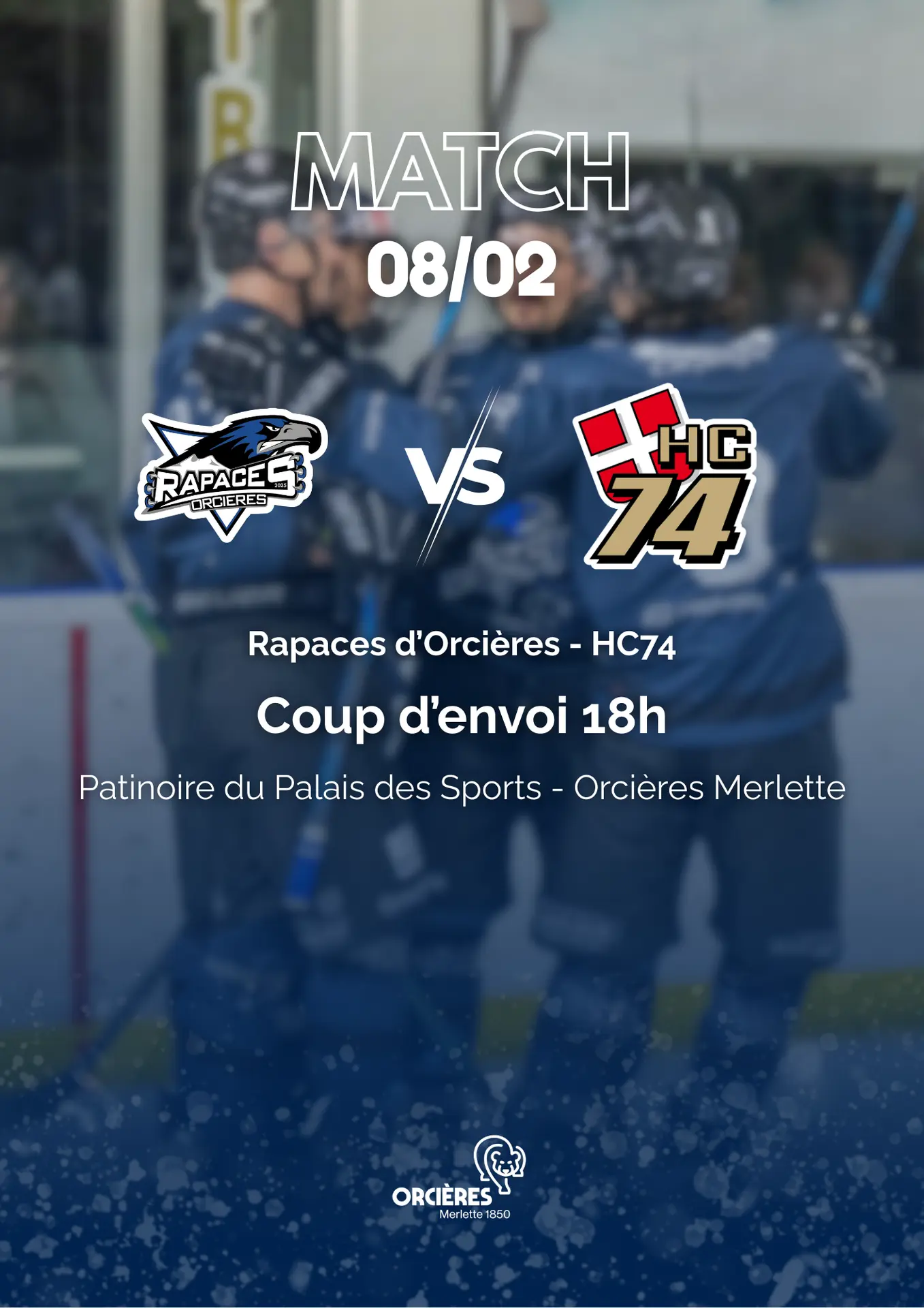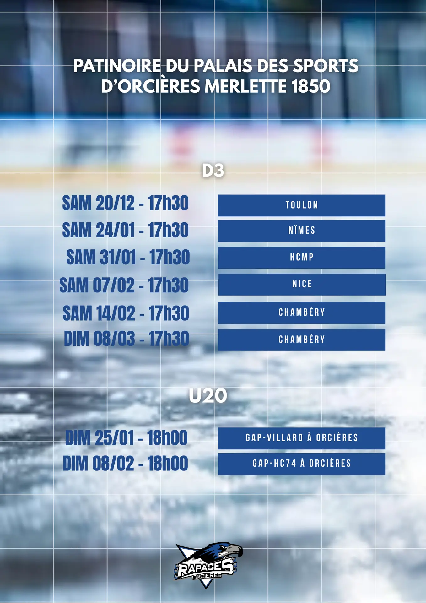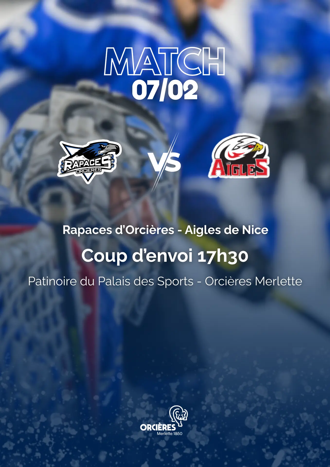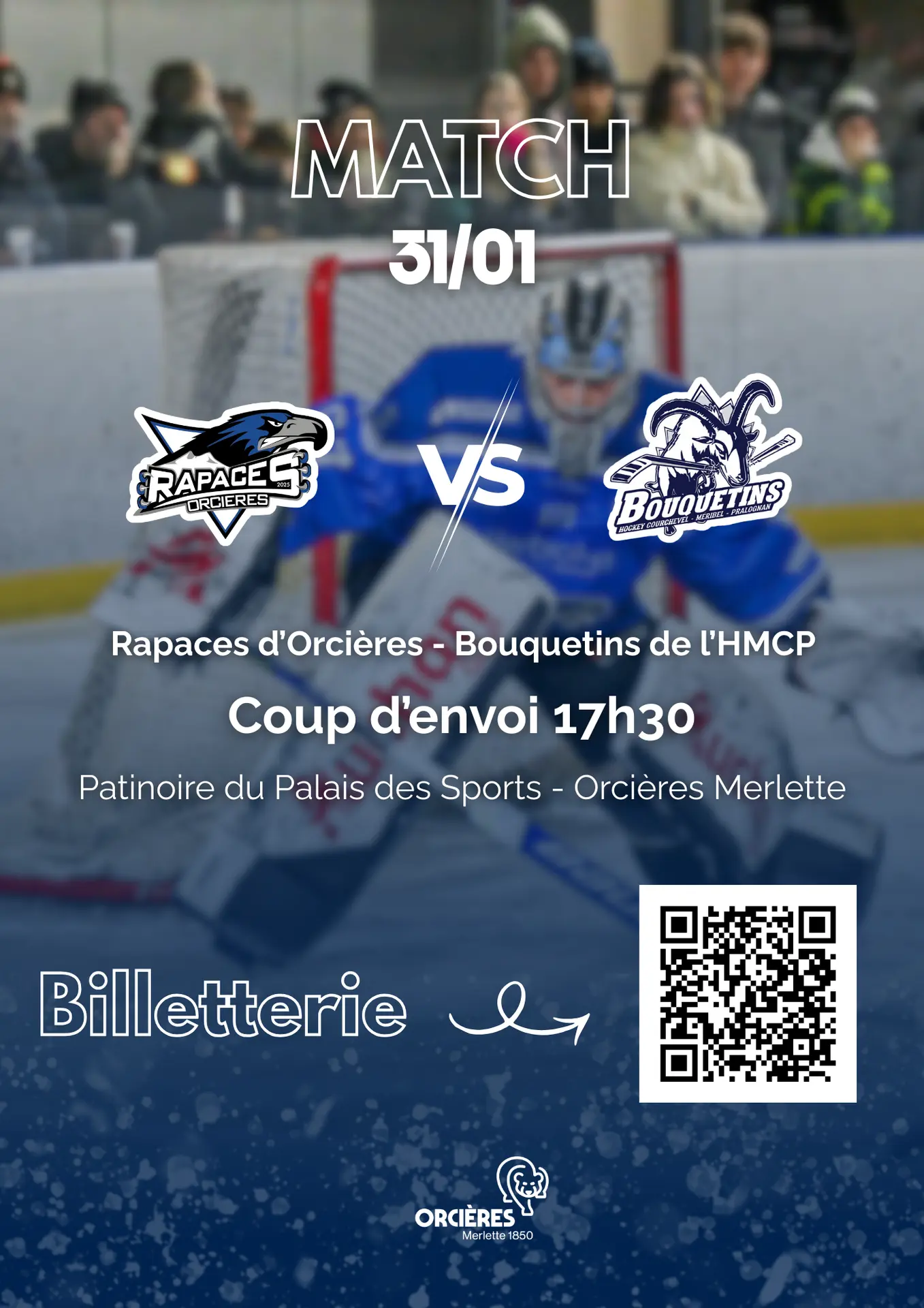 Les Rapaces d’Orcières en match ! Ouverture de la patinoire à 16h30.