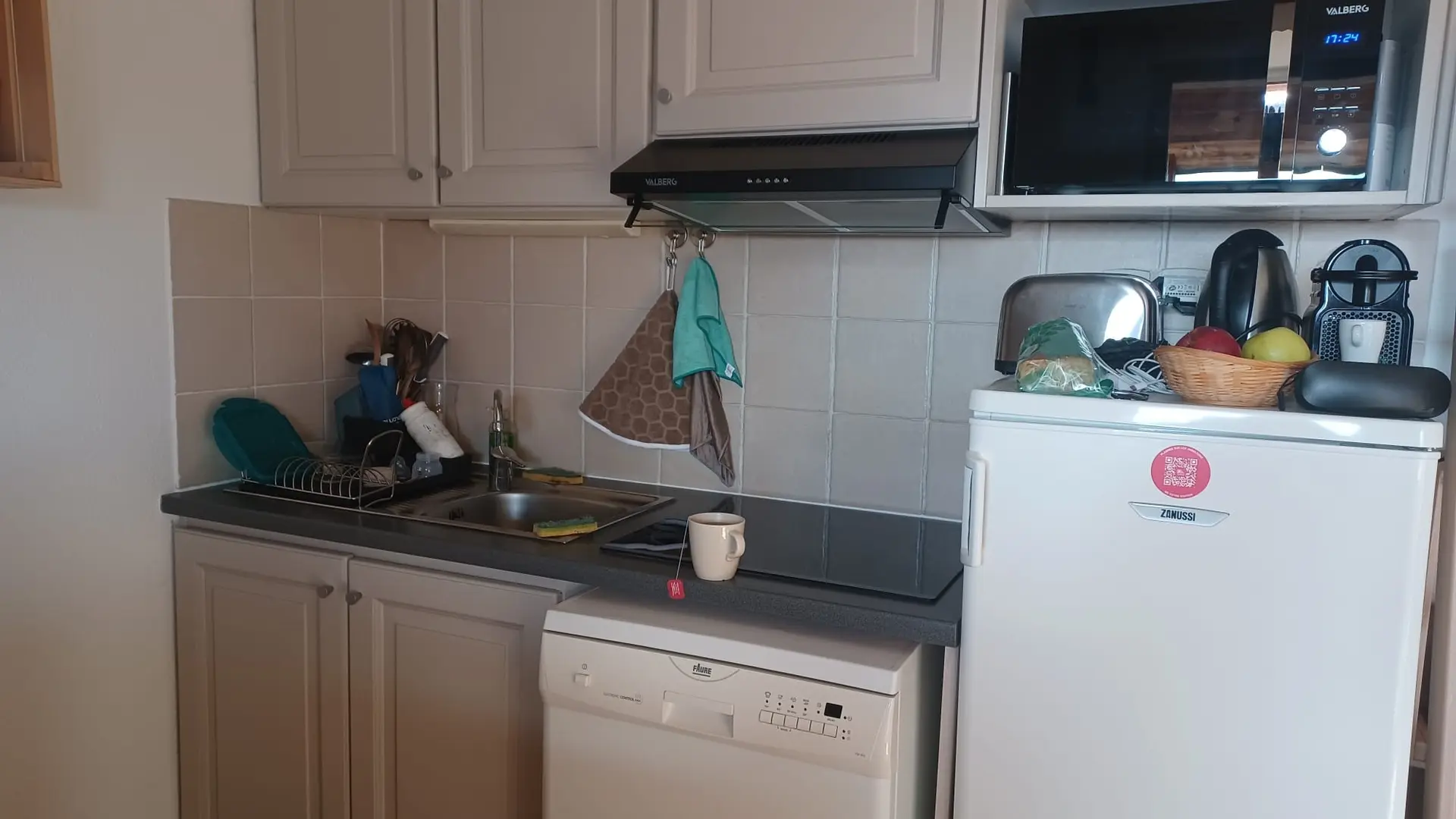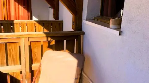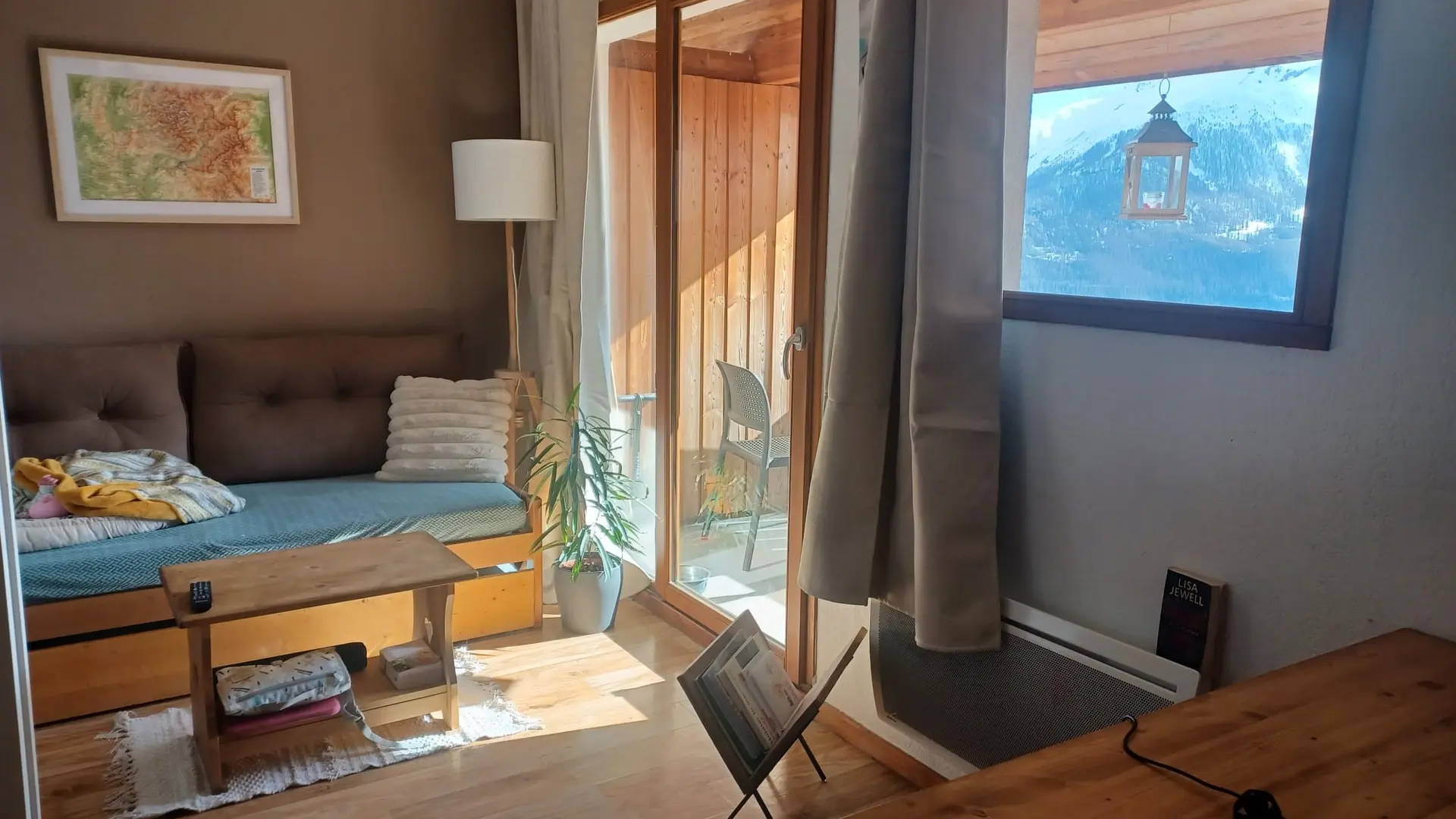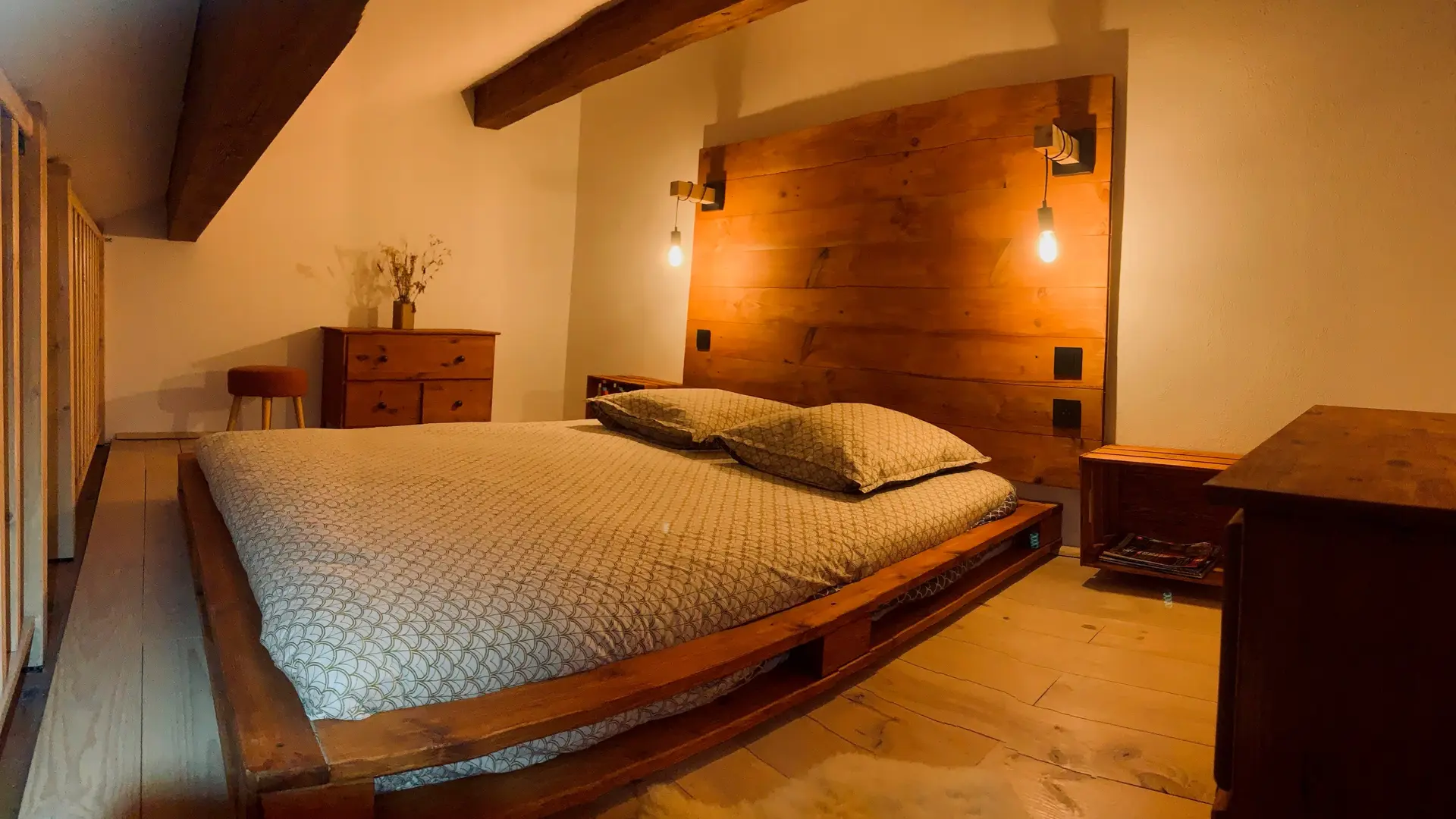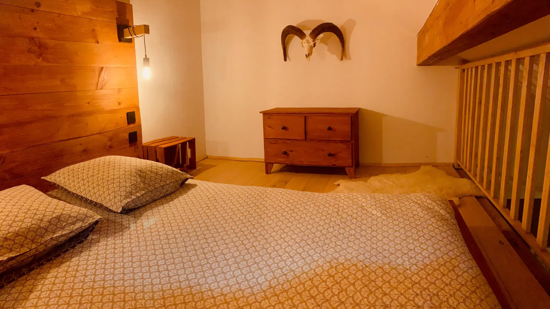 Mezzanine avec lit parental (160), accessible par une échelle, l’appartement dispose également d’un canapé lit convertible (180), et d'un "coin montagne", avec deux lits simples superposés.