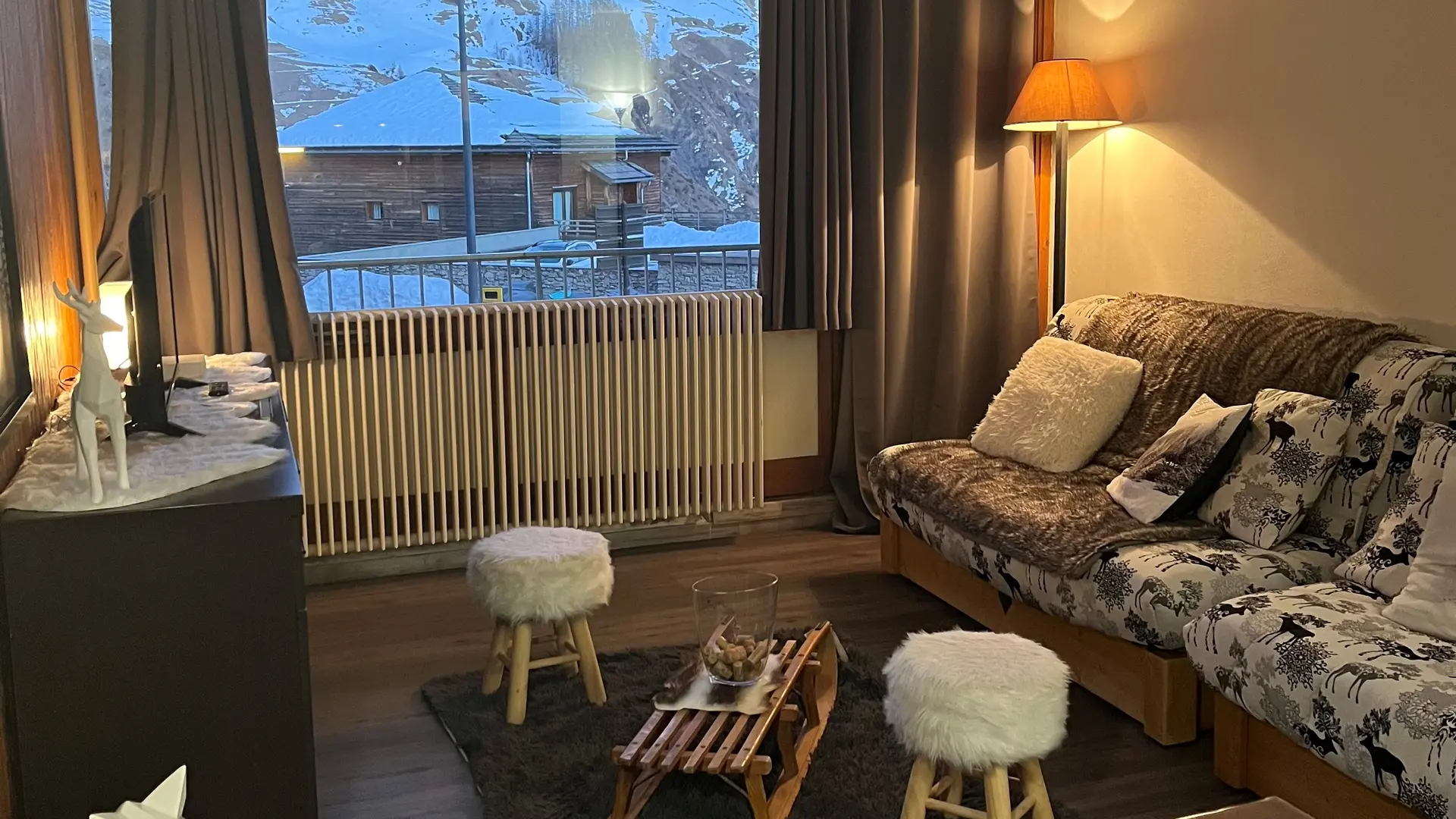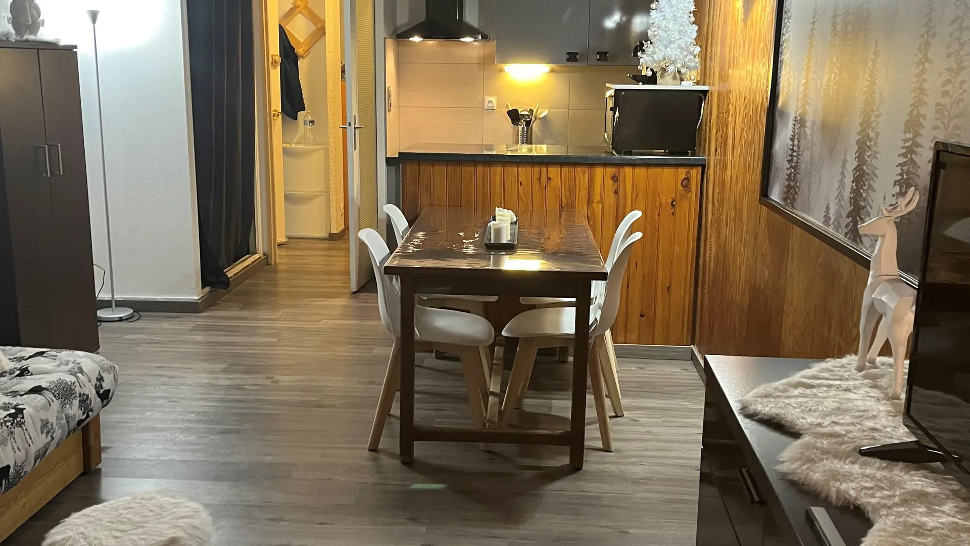 Dans le salon un BZ en 160 et un BZ en 140, TV 83cm, une terrasse, un coin montagne indépendant (porte séparatrice) avec 2 lit superposés.